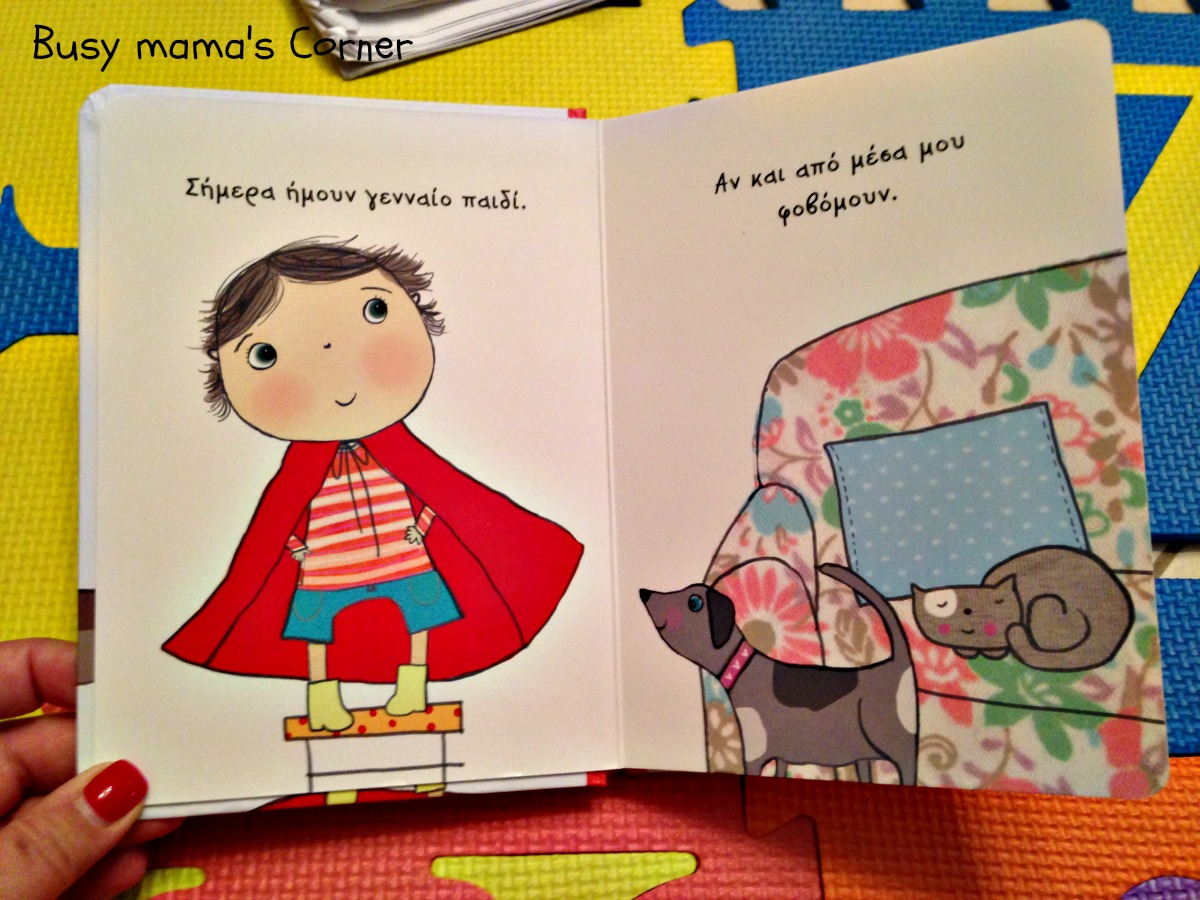 Για τον Βαγγελάκο είναι ακόμα δύσκολο να κατανοήσει έννοιες όπως γενναιότητα και ευγένεια, παρ’όλα αυτά με τα βιβλία ασχοληθήκαμε πολύ μιας και αμέσως προσωποποίησε το μικρό ήρωα δίνοντας του το όνομά του. Ειδικότερα εντυπωσιάστηκε από την κατακόκκινη κάπα του μικρού ήρωα στο βιβλίο “Είμαι παιδί γενναίο” κι αμέσως έμαθε τη λέξη. Βρήκα κι εγώ λίγο την ευκαιρία να του δείξω καινούριες λέξεις που μιλούν για συμπεριφορές και συναισθήματα περιγράφοντας τις πολύ όμορφα εικονογραφημένες σελίδες από την Κέιτι Σόντερς. Στις παρακάτω φωτογραφίες μπορείτε να δείτε το Βαγγελάκο χωμένο στην αγκαλιά μου να είναι συντονισμένος στα βιβλία.