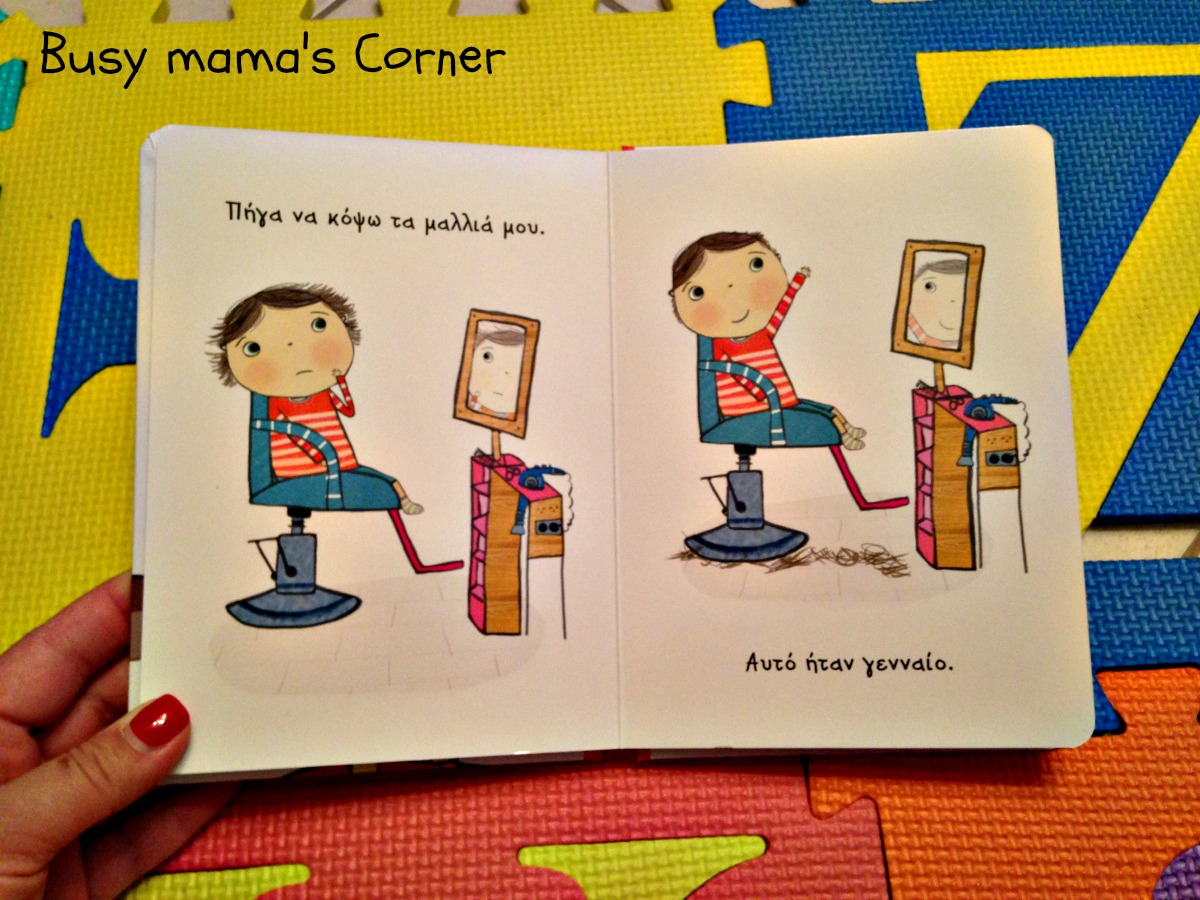 Την παρακάτω φωτογραφία την έβαλα με πολύ συγκεκριμένο σκοπό. Όπως καταλάβατε η επίσκεψή μας στο κομμωτήριο για να κόψουμε τα μαλλιά του μικρού δεν είναι και από τις πολύ ευχάριστες δραστηριότητες μιας και κλαίει πολύ. Το βιβλίο όμως μου έδωσε την τέλεια ευκαιρία να μιλήσουμε για όλο αυτό και αμέσως είδα μια διαφορετική αντιμετώπιση από τη μεριά του. (Την επόμενη φορά που θα κουρευτούμε να θυμηθώ να πάρω μαζί μου το βιβλίο!!!)